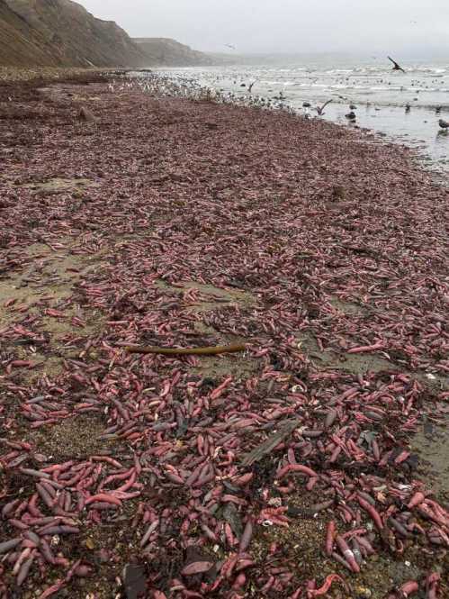 Φέτος χιλιάδες από αυτά τα ροζ «λουκάνικα» ξεβράστηκαν στις ακτές του Dreake, αλλά αυτό είναι φαινόμενο που συμβαίνει εδώ και δεκάδες χρόνια, στον κόλπο της Bodega, στο λιμάνι του Princeton, στο Moss, και στις περιοχή των Θινών του Pajaro.