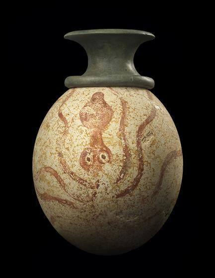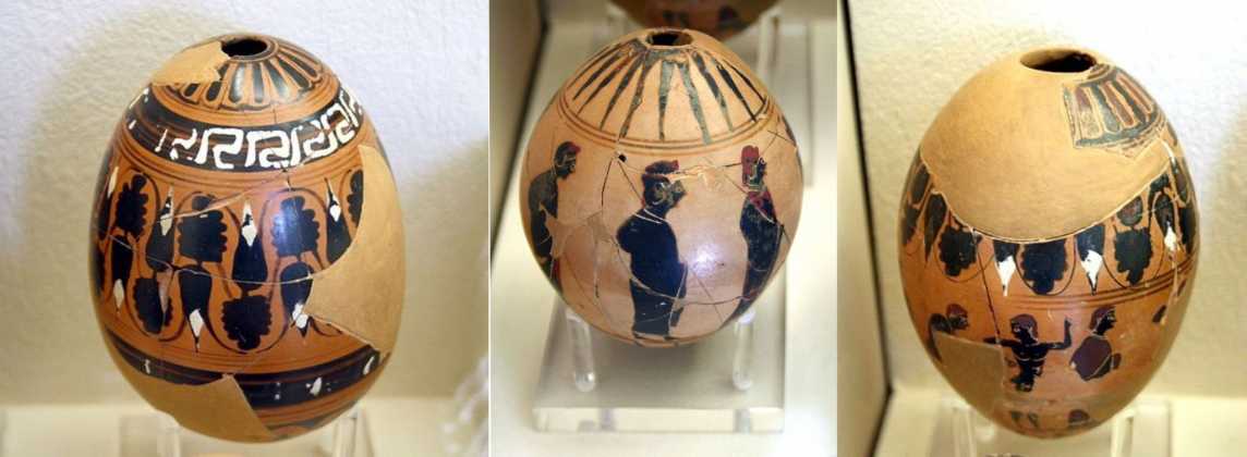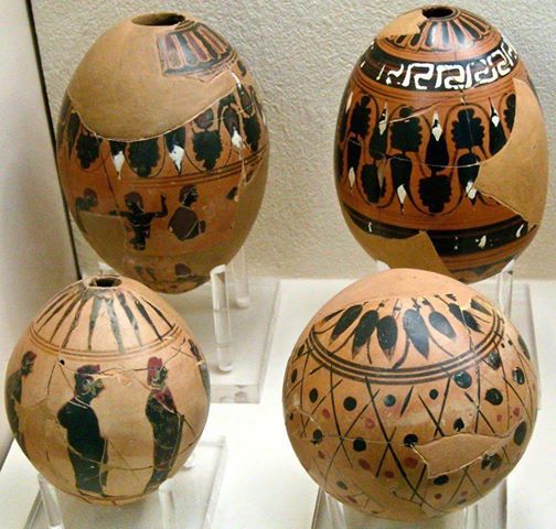 Φωτογραφίες: παραδείγματα πήλινων μελανόμορφων αυγών που βρέθηκαν σε ταφές στο νεκροταφείο του Κεραμεικού και σε ακόμα παλαιότερους Μυκηναϊκούς τάφους όπου μπορεί να θαυμάσει ο κάθε ένας το περίτεχνο της διακόσμησης τους .
