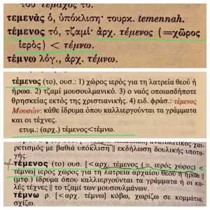 Το τέμενος λοιπόν είναι απλώς μια < αρχαία ελληνική λέξη: τέμενος (είδατε που δεν έχει αλλάξει καθόλου από τότε;) και προέρχεται από το < τέμνω που σημαίνει κόβω, χωρίζω (ενίοτε και οριοθετώ) και άμα λάχει να ξέρεις και γεωμετρία ακουμπώ ή και ενώνομαι με κάτι (σε σημείο).