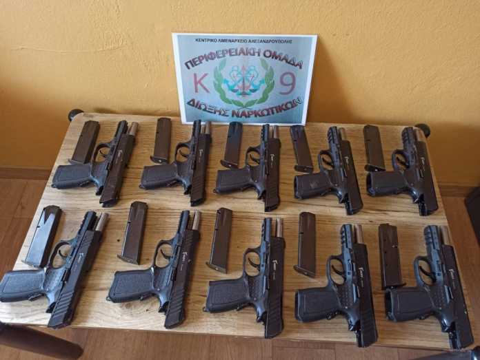 Στις 11:00 το πρωί σήμερα στελέχη της Περιφερειακής Ομάδας Δίωξης Ναρκωτικών του Κεντρικού Λιμεναρχείου Αλεξανδρούπολης, σε συνεργασία με στελέχη της Υπηρεσίας Δίωξης Ναρκωτικών της Διεύθυνσης Αστυνομίας Κομοτηνής, συνέλαβαν πέντε λαθρομετανάστες οι οποίοι είχαν στην κατοχή τους 10 πιστόλια των 9mm, Τουρκικής κατασκευής.
