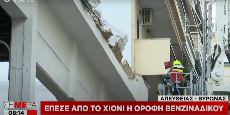 Αναστατώθηκαν οι κάτοικοι του Βύρωνα στην περιοχή της Φορμίωνος καθώς το πρωί της Πέμπτης (27/1) κατέρρευσε η οροφή ενός πρατηρίου βενζίνης λόγω του μεγάλου βάρους του χιονιού που είχε πέσει από την κακοκαιρία «Ελπίς».