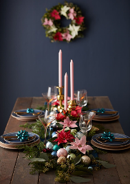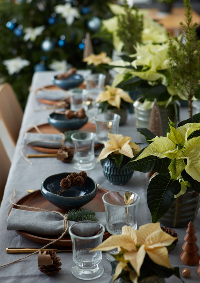 Αυτή η πανέμορφη επιτραπέζια σύνθεση, εμπνευσμένη από το Christmas Wonderland, θα εντυπωσιάσει σίγουρα τους καλεσμένους σας! Φτιάξτε ένα “ρανερ” για το τραπέζι με φρεσκοκομμένα κλαδιά πεύκου, κεριά και μικρές γλάστρες με αλεξανδρινά σε διαφορετικά χρώματα και προσθέστε διάφορα στολίδια και διακοσμητικά. Tip: Προσθέστε μερικά κλαδιά ευκάλυπτου, για να προσδώσετε μια ιδιαίτερη νότα στη διακόσμησή σας.