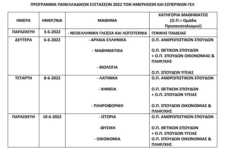 – Έναρξη πανελλαδικών εξετάσεων ημερήσιων και εσπερινών γενικών λυκείων: 3 Ιουνίου 2022