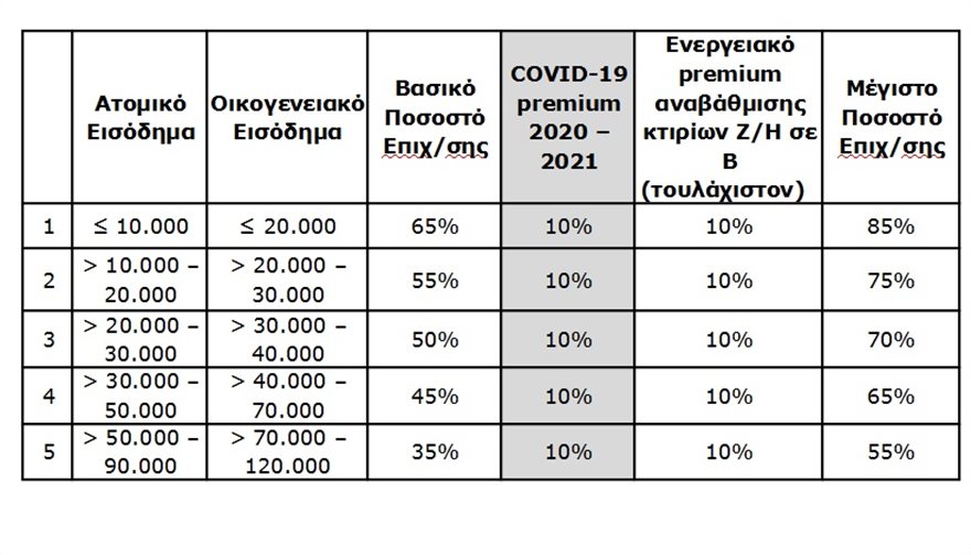 Δίνεται οριζόντια σε όλους τους ιδιοκτήτες βασικό ποσοστό επιχορήγησης 60% ΑΝΕΞΑΡΤΗΤΟΥ εισοδήματος το οποίο προσαυξάνεται με 10% για τα έτη 2020 – 2021 COVID-19 premium ενώ
