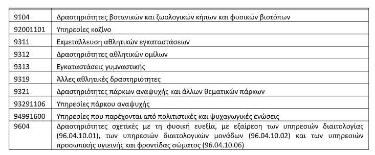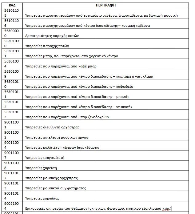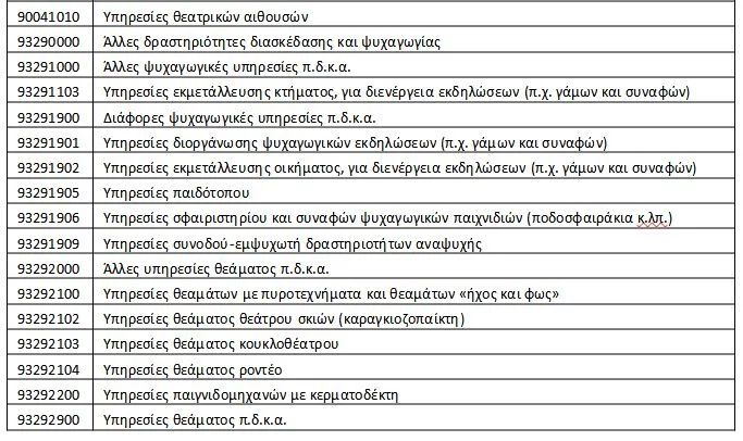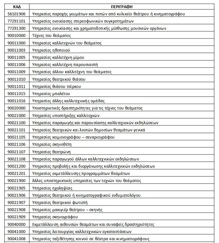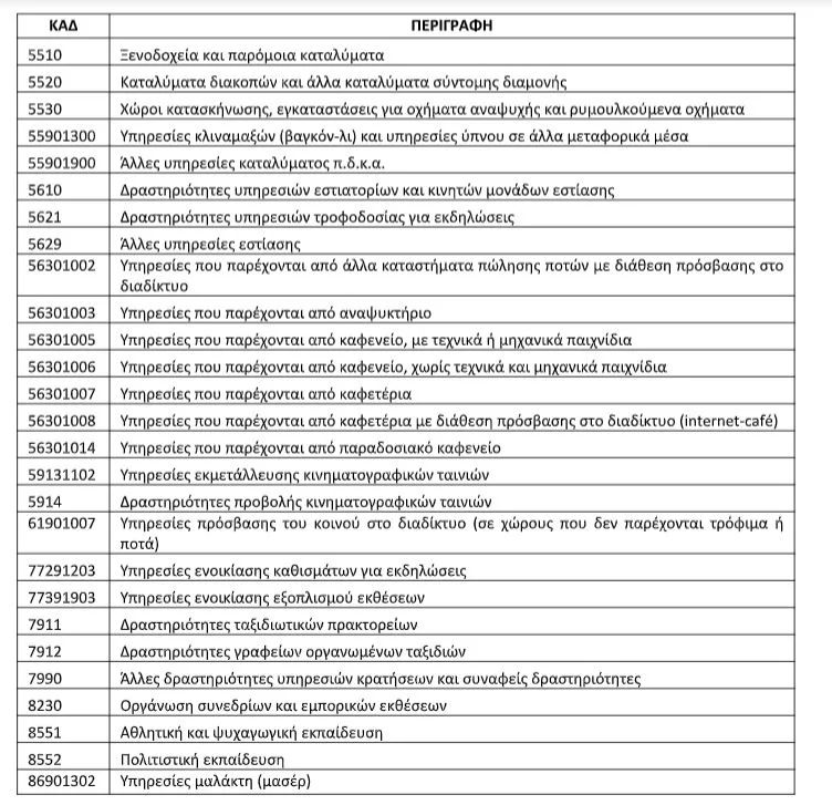 Ολόκληρος ο κατάλογος των κωδικών αριθμών δραστηριότητας (κύριος ΚΑΔ ή ΚΑΔ με τα μεγαλύτερα έσοδα) επιχειρήσεων οι οποίες δικαιούνται να θέσουν σε αναστολή έως το 100% των εργαζομένων που διατηρούσαν την 30ή/12/2021.