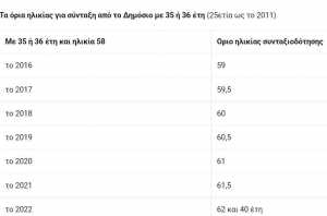 Στο Δημόσιο δεν αρκεί μόνο η 35ετία, αλλά θα πρέπει οι υπάλληλοι να έχουν συμπληρωμένο και το 58ο έτος πριν το 2022 ώστε να κλειδώσουν όριο ηλικίας συνταξιοδότησης κάτω των 62 ετών.