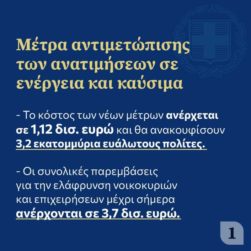 Όπως σημείωσε ο κυβερνητικός εκπρόσωπος Γ. Οικονόμου, κατά την εισαγωγική του τοποθέτηση, τα μέτρα ξεπερνούν συνολικά το 1 δισ. ευρώ και απευθύνονται σε 3,2 εκατ. πολίτες.