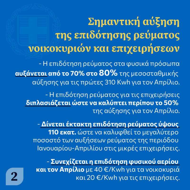 α. «Αυξάνουμε σημαντικά την επιδότηση ρεύματος σε νοικοκυριά επιχειρήσεις. Το κόστος αυτού του μέτρου φθάνει τα 640 εκατ. για τον Απρίλιο»