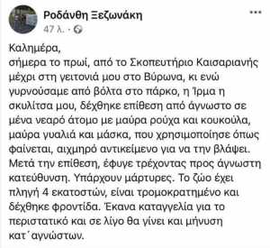 Όπως χαρακτηριστικά αναφέρει, άγνωστος επιτέθηκε με αιχμηρό αντικείμενο στο σκυλάκι της σήμερα το πρωί κατά τη διάρκεια της βόλτας τους. Ο νεαρός φορώντας μαύρα ρούχα, μαύρα γυαλιά, κουκούλα και μάσκα επιχείρησε να τραυματίσει σοβαρά το ζώο και στη συνέχεια να διαφύγει τρέχοντας προς άγνωστη κατεύθυνση.