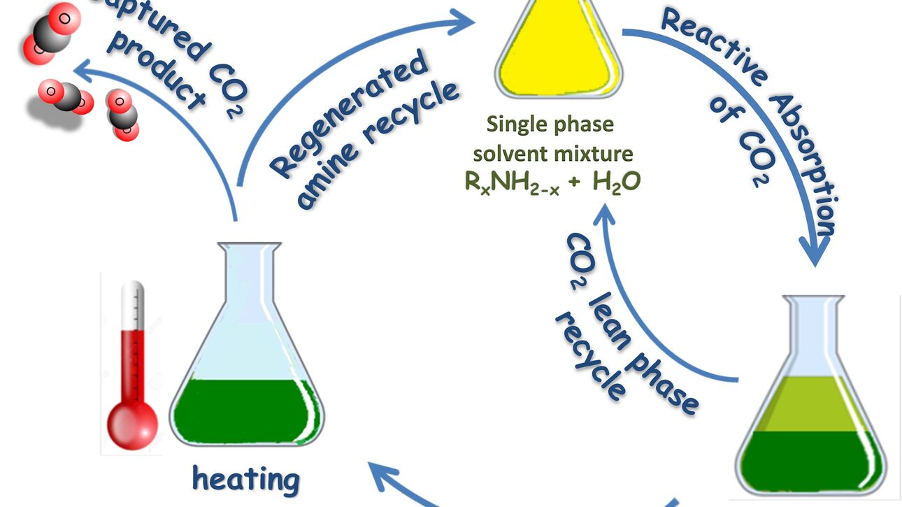 Τα μίγματα αυτά καταφέρνουν να δεσμεύουν το CO2 με πολύ μικρότερη απαιτούμενη ενέργεια, μειώνοντας έτσι το λειτουργικό κόστος της δέσμευσης κατά περίπου 40 % από την υπάρχουσα καλύτερη τεχνολογία. Το νέο υδατικό διάλυμα αμινών που ανακαλύφθηκε έχει τη μοναδική ιδιότητα ότι κατά την χημική απορρόφηση του CO2 από τις αμίνες, το μίγμα τους διαχωρίζεται αυθορμήτως, χωρίς την χρήση θερμότητας (δηλαδή χωρίς επιπρόσθετο κόστος ενέργειας), σε δυο μη-αναμίξιμες υγρές φάσεις.