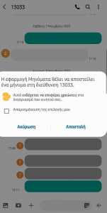 Βήμα 6: Και καταλήξαμε στη πολυπόθητη οθόνη όπου το τηλέφωνό σας σάς ρωτάει αν του επιτρέπετε να στείλει μήνυμα στο 13033! Εσείς απλώς επιλέγετε “Αποστολή” και ετοιμάζεστε να βγείτε.