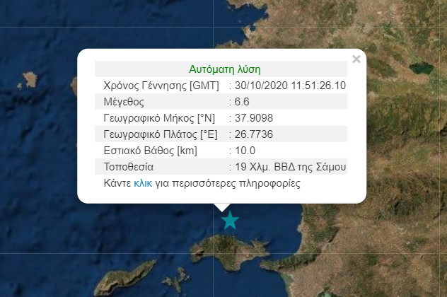 Ισχυρός σεισμός 19 χιλιόμεντρα βόρεια-βορειοδητικά της Σάμου, μεγέθους 6,6 βαθμών της κλίμακας Ρίχτερ με εστιακό βάθος περίπου 10 χλμ.