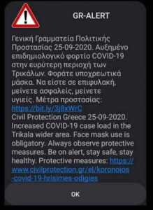 Συγκεκριμένα, στις 20:00 περίπου το βράδυ της Παρασκευής, οι Τρικαλινοί έλαβαν SMS από τη Γενική Γραμματεία Πολιτικής Προστασίας στον αριθμό 112, με σαφείς οδηγίες για κατοίκους και επισκέπτες, ενώ τονίστηκε η υποχρεωτική χρήση μάσκας σε εξωτερικούς και εσωτερικούς χώρους.