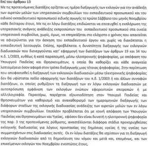 Με τη δεύτερη από τις δυο διατάξεις του υπουργείου Παιδείας που εισήχθησαν σε νομοσχέδιο του ΥΠΟΙΚ και αφορά την ανάδειξη αιρετών εκπροσώπων στα υπηρεσιακά συμβούλια του εκπαιδευτικού προσωπικού εκπαιδευτικού προσωπικού ειδικής αγωγής και εκπαίδευσης, στο άρθρο 13 επισημαίνεται ότι οι εκλογές θα πραγματοποιούνται «ημέρα Σάββατο (αντί για εργάσιμη ημέρα και ώρα), προκειμένου να μην διακόπτεται στο ελάχιστο η εκπαιδευτική λειτουργία και να μην αναστέλλεται η λειτουργία των σχολείων. Ταυτόχρονα, δίνεται η δυνατότητα για ηλεκτρονική διεξαγωγή της ψηφοφορίας».