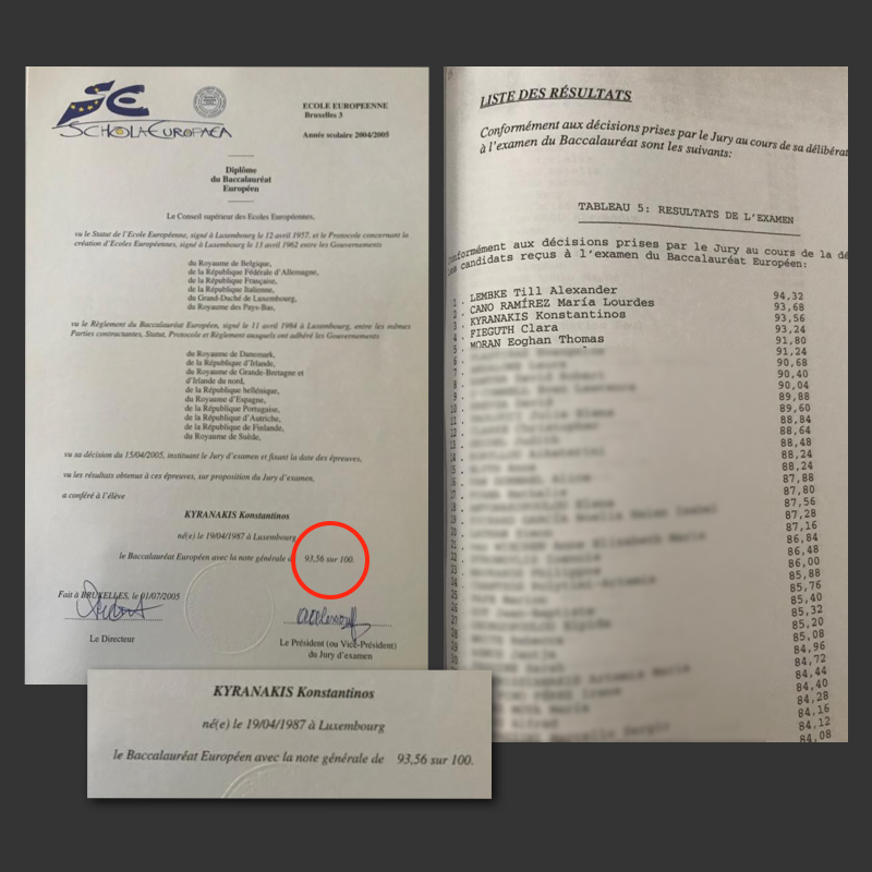Η απαιτητή βαθμολογία για να σε δεχθούν για συνέντευξη στα κορυφαία ευρωπαϊκά πανεπιστήμια όπως η Οξφόρδη και το Cambridge ήταν 85/100. Οι βαθμολογητές είναι 2 ή και περισσότεροι, και διαγωνίζεσαι με μαθητές από όλη την Ευρώπη. Μετά από πάρα πολύ μεγάλη προσπάθεια, και ατελείωτα ξενύχτια διαβάσματος και επαναλήψεων πήρα το Baccalaureate με βαθμό 93,5/100 και ήμουν τρίτος σε κατάταξη μαθητής από όλα τα τμήματα όλων των εθνικοτήτων.