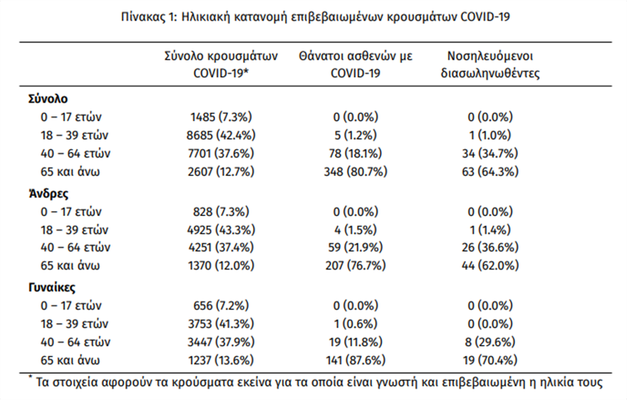 Τέλος, έχουμε 1 ακόμα καταγεγραμμένους θανάτους και 431 θανάτους συνολικά στη χώρα. 161 (37.4%) γυναίκες και οι υπόλοιποι άνδρες. Η διάμεση ηλικία των θανόντων συμπολιτών μας ήταν τα 78 έτη και το 96.5% είχε κάποιο υποκείμενο νόσημα ή/και ηλικία 70 ετών και άνω.