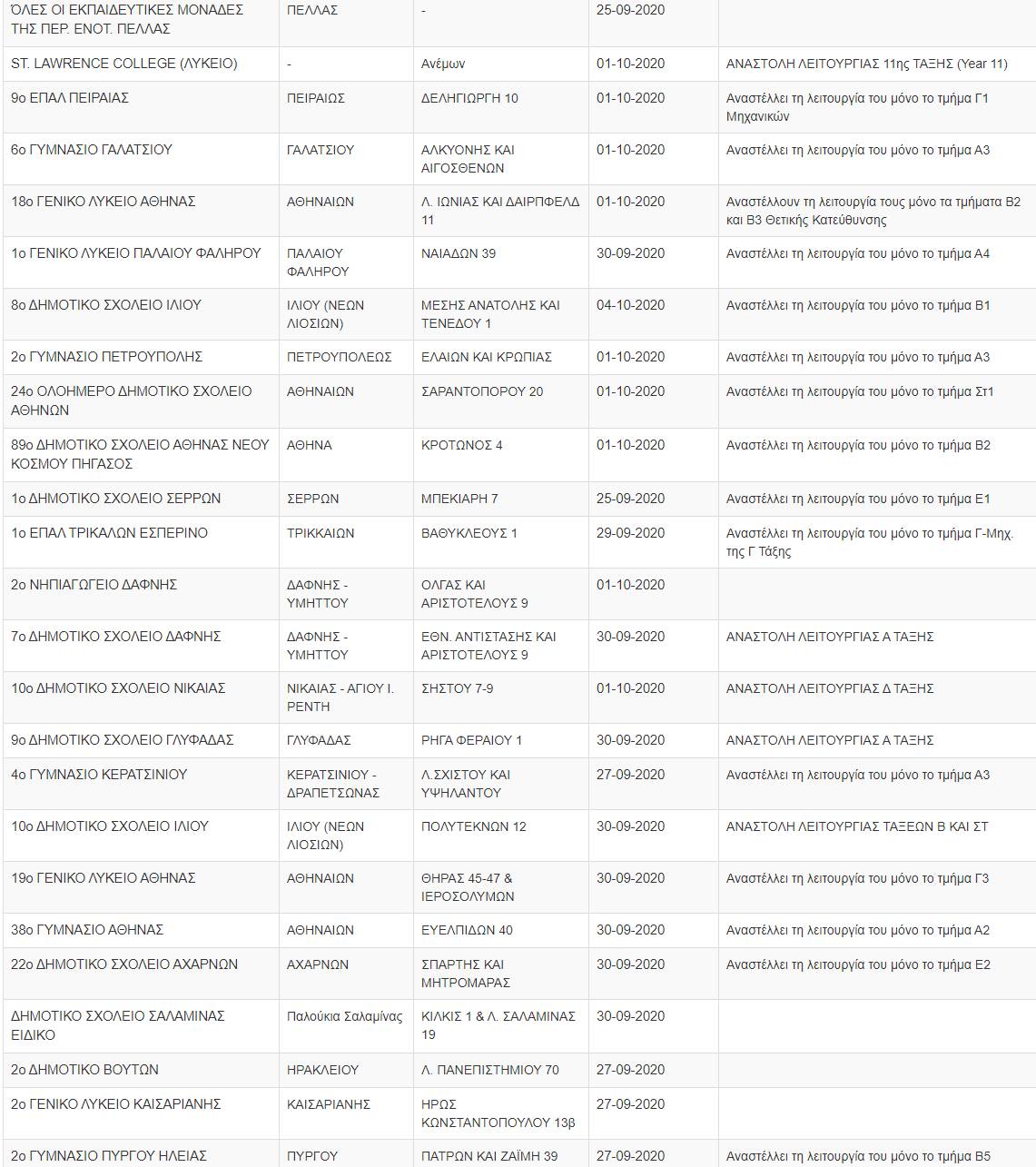 Στη λίστα που ακολουθεί μπορείτε να δείτε όλες τις σχολικές μονάδες και δεξιά τα τμήματα τα οποία αναστέλλουν τη λειτουργία τους.