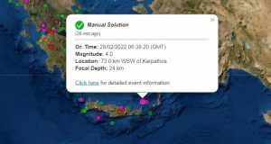 Σεισμός 4,1 Ρίχτερ σημειώθηκε 43 χλμ. βορειανατολικά της Σητείας στην Κρήτη, στις 08:38 ώρα Ελλάδος, σύμφωνα με ανακοίνωση του Γεωδυναμικού Ινστιτούτου.