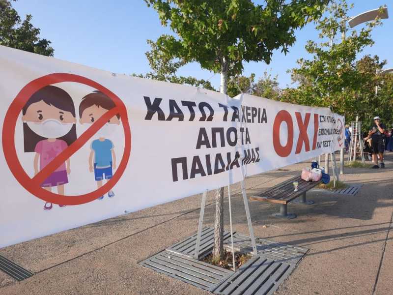 «Όχι στα υποχρεωτικά εμβόλια, σε μάσκες και σε τεστ» είναι το σύνθημα σε ένα από τα πανό που αναρτήθηκαν στον χώρο της διαμαρτυρίας.