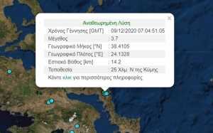 Σεισμική δόνηση 3,7 βαθμών της κλίμακας Ρίχτερ σημειώθηκε στην Εύβοια το πρωί της Τετάρτης (09/12), σύμφωνα με την αναθεωρημένη λύση του Γεωδυναμικού Ινστιτούτου του Εθνικού Αστεροσκοπείου Αθηνών.