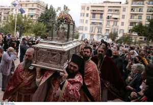 Συνωστισμός επικράτησε στον προαύλιο χώρο του ναού και το πρωί, κατά τη διάρκεια της λιτανείας της εικόνας της Παναγίας της Παραμυθίας, των χαριτόβρυτων λειψάνων και της εικόνας του Αγίου Δημητρίου.