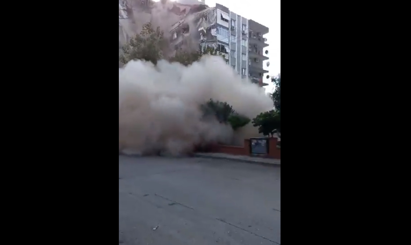 Πολυκατοικία στη Σμύρνη η οποία έχει υποστεί, προφανώς, πολύ μεγάλη ζημιά από το σεισμό, καταρρέει σαν χάρτινος πύργος