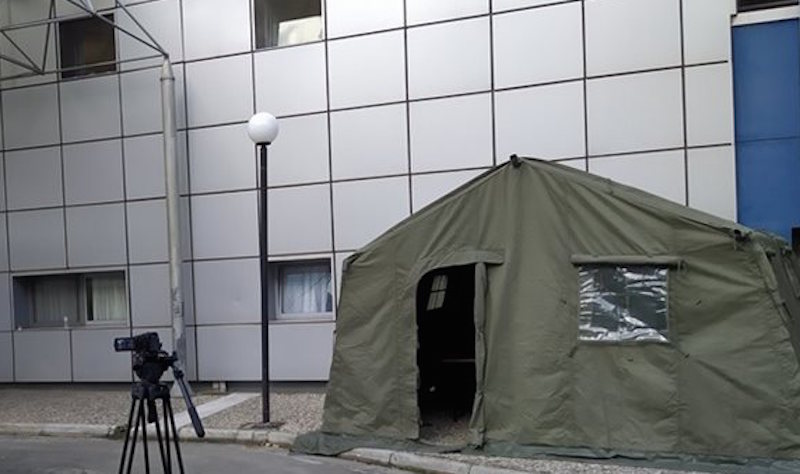 Στρατιωτικές σκηνές στήθηκαν σήμερα το πρωί στον προαύλιο χώρο του νοσοκομείου Βόλου από κλιμάκιο του στρατού και της Ταξιαρχίας Πεζοναυτών.