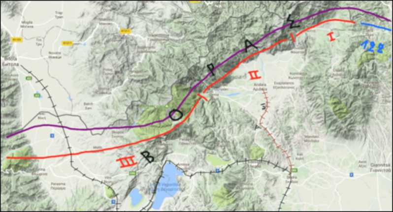 Η οροσειρά του Βόρα εκτείνεται από Βεύη στη Δύση μέχρι Περίκλεια/Χούμα στην Ανατολή. Με μωβ χρώμα δίδεται κατά προσέγγιση το μέτωπο στα μέσα Αυγούστου 1916 που συνέπιπτε με τα σύνορα Ελλάδας – Σερβίας. Με κόκκινη γραμμή η θέση των τριών σερβικών στρατιών (Ι, ΙΙ, ΙΙΙ). Με μπλε ο τομέας της 122ης γαλλικής μεραρχίας πεζικού. Η μαύρη γραμμή δείχνει τη σιδηροδρομική γραμμή Θεσσαλονίκης – Μοναστηρίου (Μπίτολα) και με καφέ χρώμα η γραμμή ντεκωβίλ από Σκύδρα σε Άψαλο (Α), Ξιφιανή (Ξ) και Αριδαία