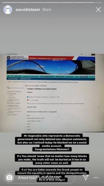 Στη συνέχεια Γιώργος Σαββίδης μπλοκαρίστηκε από την πρόσβασή του στο λογαριασμό του υφυπουργού Αθλητισμού στο instagram αυτό ακριβώς το μπλοκάρισμα δημοσιοποίησε στο δικό του λογαριασμό με το σχόλιο “σοβαρή κίνηση από έναν σοβαρό υπουργό”.