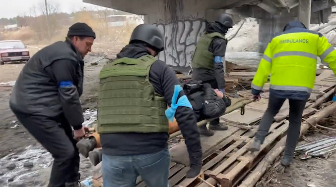 Ein 51-jähriger US-Journalist ist heute in Irpin, einem Vorort von Kyiv, getötet worden. Sein Kollege, mit dem er unterwegs war, konnte verletzt gerettet werden. Das Video, das wir unter der Brücke aufgenommen haben, zeigt die Evakuierung des verletzten Kollegen. pic.twitter.com/TemuQaUL50