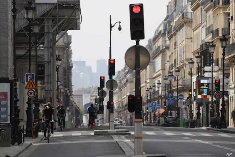 A man rides his bike in an empty street during a nationwide confinement to counter the COVID-19 in Paris, Tuesday, April 21, 2020. A flood of new research suggests that far more people have had the Covid-19 without any symptoms, fueling hope that it will turn out to be much less lethal than originally feared. (AP Photo/Christophe Ena)
