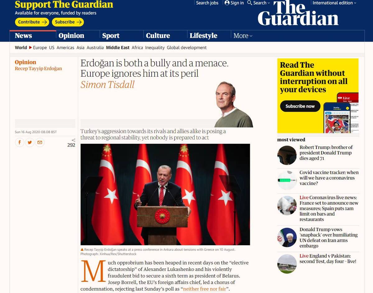 «Η επιθετικότητα της Τουρκίας απέναντι τόσο στους αντιπάλους της όσο και στους συμμάχους της συνιστά απειλή για την περιφερειακή σταθερότητα, και όμως κανείς δεν είναι έτοιμος να δράσει», αναφέρει η βρετανική εφημερίδα Guardian σε άρθρο της, στο οποίο αποκαλεί ανοιχτά τον Τούρκο Πρόεδρο «νταή» και «απειλή».