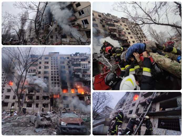 Σύμφωνα με την Κρατική Υπηρεσία Έκτακτης Ανάγκης της Ουκρανίας το πολυόροφο κτίριο βρίσκεται στη γειτονιά Ομπολόν και χτυπήθηκε από οβίδα στις 5 τα ξημερώματα.