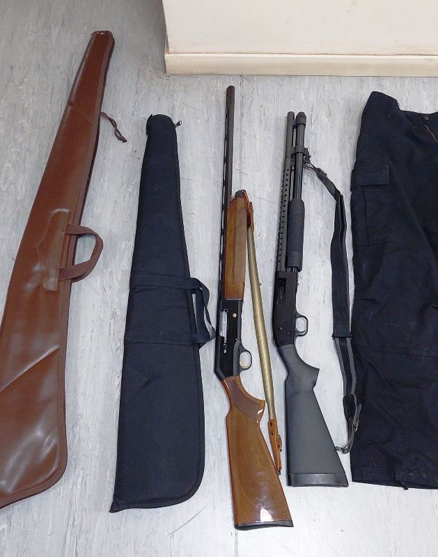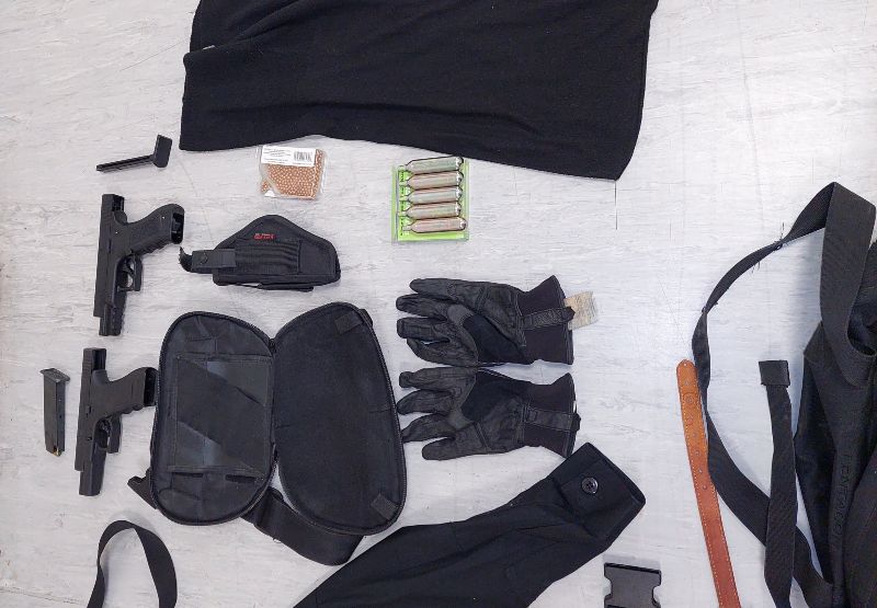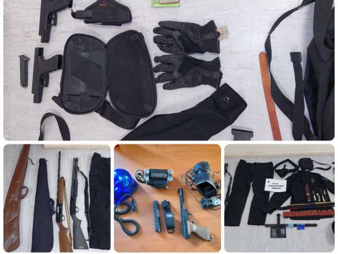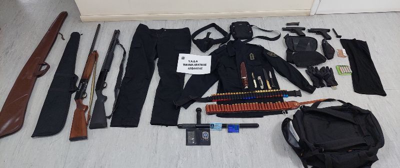 -2- πλαστικοποιημένες ταυτότητες με τη φωτογραφία του 36χρονου με στολή της Ελληνικής Αστυνομίας, χιτώνιο και παντελόνι αστυνομικής στολής, πορτοφόλι με μεταλλικό σήμα της Ελληνικής Αστυνομίας, κουκούλα τύπου full face.