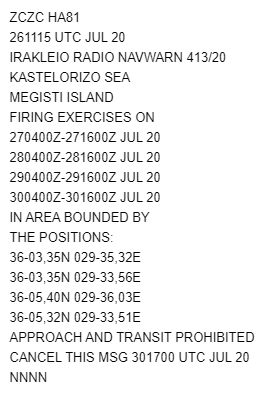 Σύμφωνα με την Navtex απαγορεύεται στους ναυτιλλομένους η διέλευση από την δεσμευμένη περιοχή.