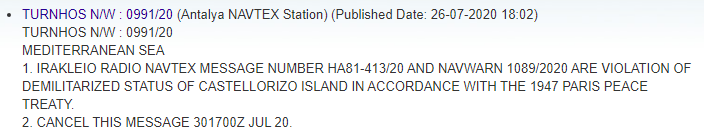 Οι τούρκοι προσπάθησαν να “απαντήσουν” με “αντιNAVTEX” η οποία χαρακτηρίζει την ελληνική NAVTEX ως παράνομη, με βάση την συνθήκη ειρήνης των Παρισίων το 1947!!