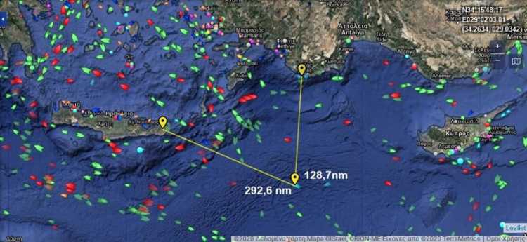 Αυτή τη στιγμή το τουρκικό πλοίο πλέει σε απόσταση 128 ναυτ.μιλίων από τη Μεγίστη (Καστελλόριζο) και 292 ναυτ.μιλίων από το την Κρήτη (όπως προκύπτει και από τους χάρτες του ειδικού ερευνητή Νίκου Τριάντη).