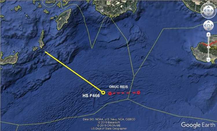 Από την Ελληνική φρεγάτα, ο κυβερνήτης έχει ενημερώσει, χωρίς να λάβει απάντηση, τον τούρκο καπετάνιο ότι δεν επιτρέπεται να διενεργήσει έρευνες (έχει ήδη ρίξει καλώδια στο νερό).