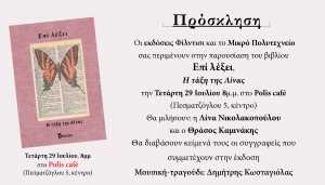 Την Τετάρτη 29 Ιουλίου 8 μμ θα γίνει στο αίθριο του Polis café (Πεσματζόγλου 5, κέντρο) η πρώτη παρουσίαση του βιβλίου «Επί λέξει, Η τάξη της Λίνας».