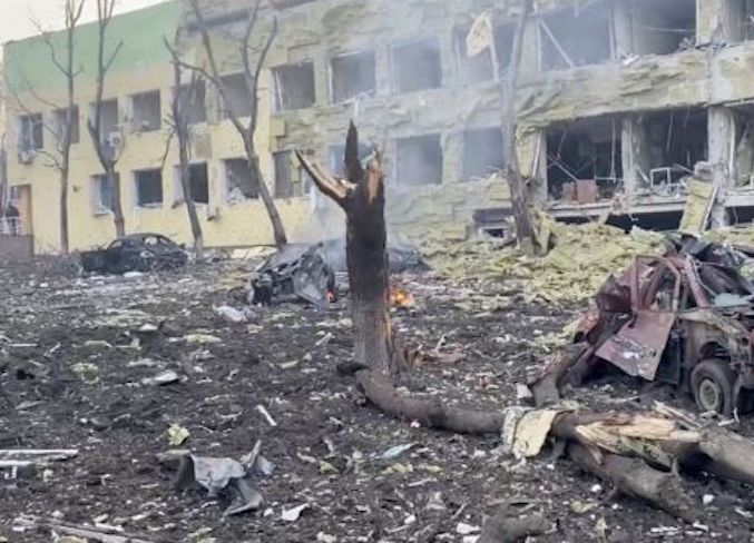 Debris is seen on site of the destroyed Mariupol children's hospital as Russia's invasion of Ukraine continues, in Mariupol, Ukraine, March 9, 2022 in this still image from a handout video obtained by Reuters. Ukraine Military/Handout via REUTERS THIS IMAGE HAS BEEN SUPPLIED BY A THIRD PARTY.
