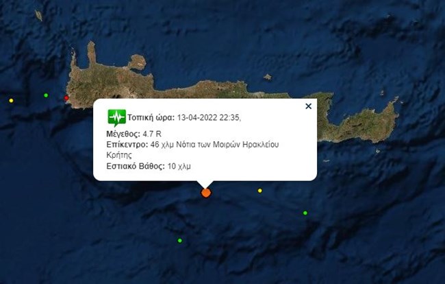 Συγκεκριμένα, σύμφωνα με το Γεωδυναμικό Ινστιτούτο, η σεισμική δόνηση είχε μέγεθος 4,7 βαθμών της κλίμακας Ρίχτερ και σημειώθηκε στη θαλάσσια περιοχή νότια της Κρήτης, 45 χιλιόμετρα νοτιοδυτικά των Καλών Λιμένων Ηρακλείου.