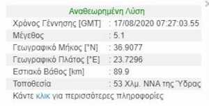 Το επίκεντρο εντοπίζεται 53 χλμ. νοτιο-νοτιοανατολικά της Ύδρας.