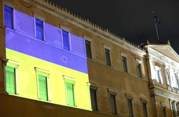 Σε μια συμβολική πρωτοβουλία προχώρησε το Σάββατο 26 Φεβρουαρίου η Ελλάδα και η πρόσοψη του Μεγάρου της Βουλής των Ελλήνων, πάνω από το Μνημείο του Άγνωστου Στρατιώτη φωταγωγήθηκε με τα χρώματα της σημαίας της Ουκρανίας μέχρι τα μεσάνυχτα.
