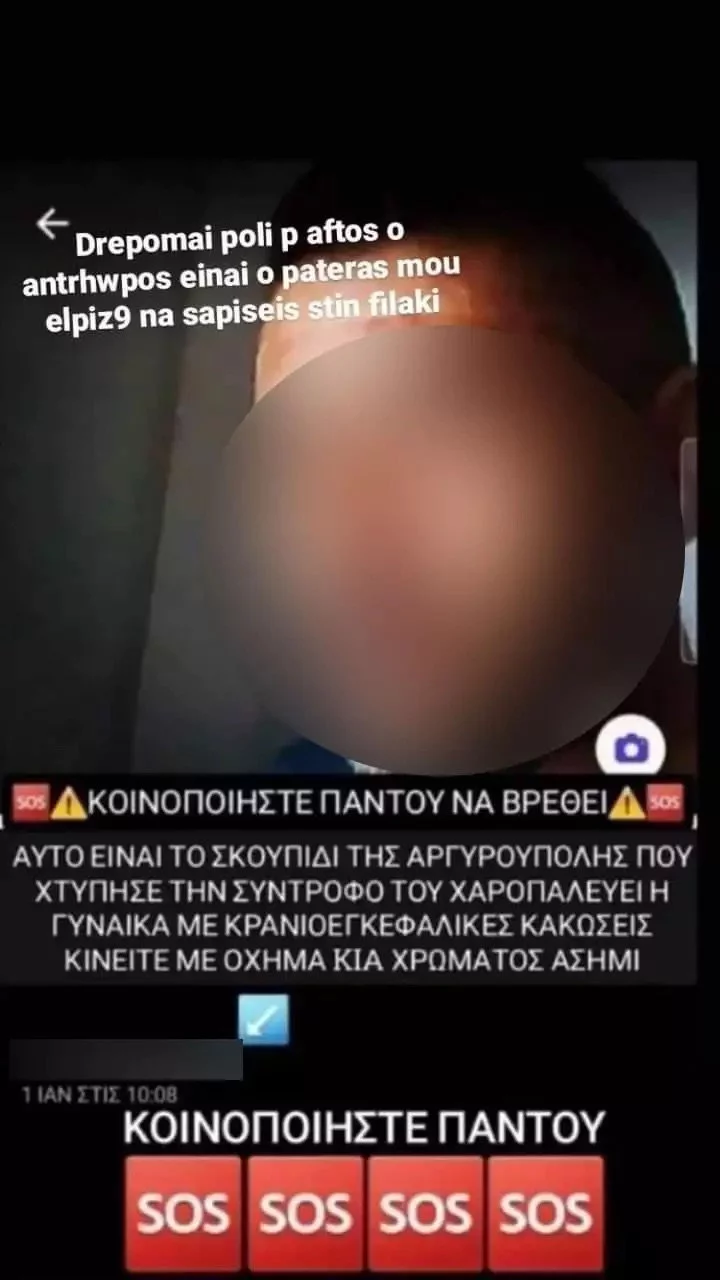 Μάλιστα η κοπέλα συνεχίζει, δίνοντας και στοιχεία για τον εντοπισμό του: «Κοινοποιήστε παντού για να βρεθεί! Αυτό είναι το σκουπίδι της Αργυρούπολης που χτύπησε τη σύντροφό του, χαροπαλεύει η γυναίκα με κρανιοεγκεφαλικές κακώσεις, κινείται με όχημα KIA χρώματος ασημί».