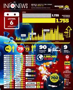 Τα επιβεβαιωμένα κρούσματα παγκοσμίως ανέρχονται σε 1.289.380 και οι νεκροί σε 70.590.