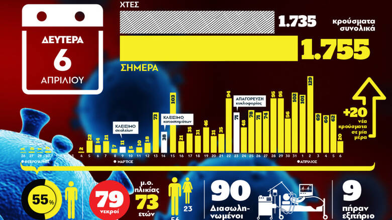 Συνολικά 79 άτομα έχουν χάσει τη ζωή τους από τον κορoνοϊό στην Ελλάδα, όπως φαίνεται και από το ημερήσιο γράφημα που δημοσιεύει το Greek Infographics.