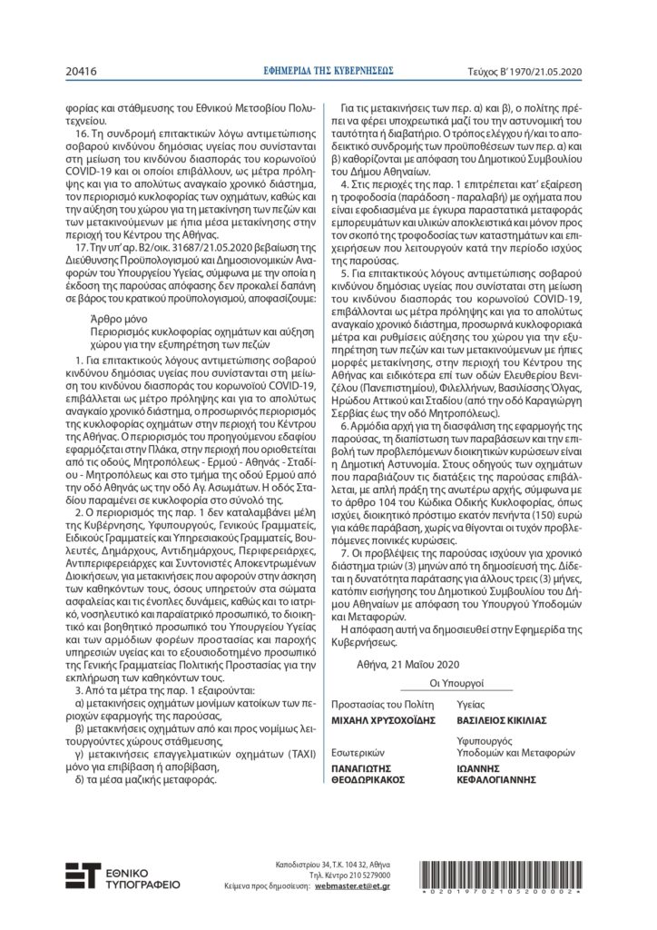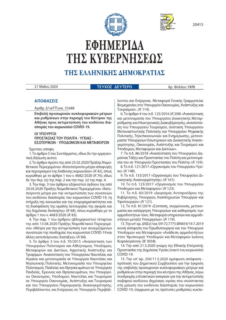 «Για επιτακτικούς λόγους αντιμετώπισης σοβαρού κινδύνου δημόσιας υγείας που συνίστανται στη μείωση του κινδύνου διασποράς του κορωνοϊού COVID-19, επιβάλλεται ως μέτρο πρόληψης και για το απολύτως αναγκαίο χρονικό διάστημα, ο προσωρινός περιορισμός της κυκλοφορίας οχημάτων στην περιοχή του Κέντρου της Αθήνας.