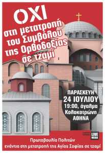 Συγκέντρωση διαμαρτυρίας σήμερα Παρασκευή στο κέντρο της Αθήνας στην πλατεία Κολοκοτρώνη ετοιμάζει η Πρωτοβουλία Πολιτών ενάντια στη Μετατροπή της Αγίας Σοφίας σε Τζαμί.