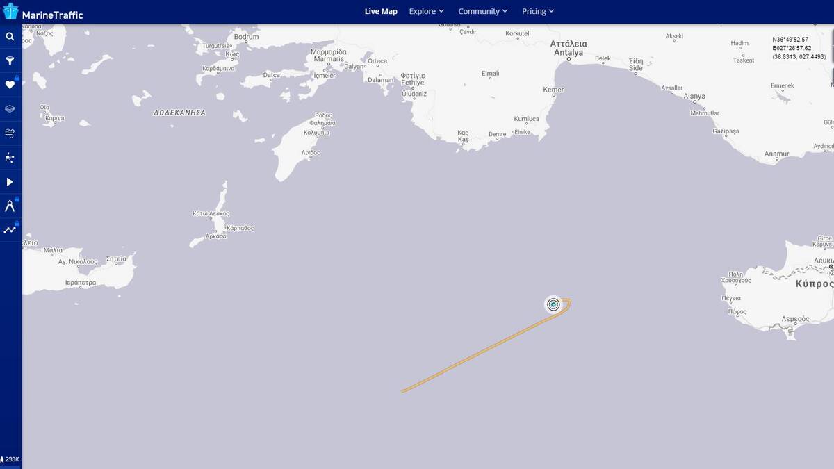 Το στίγμα του πλοίου από το marinetraffic.com στις 19:15: