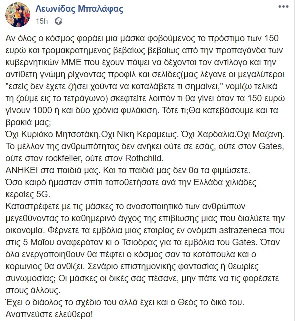 Ο γνωστός τραγουδοποιός Λεωνίδας Μπαλάφας όμως (πρέπει να το έχει το επώνυμο, δεν εξηγείται διαφορετικά…) πέρασε σε άλλο επίπεδο. Ενοποίησε όλες τις θεωρίες μαζί! Και μας έκανε και μία απόκάλυψη: ότι το Lockdown έγινε γιατί όσο εμείς ήμασταν κλεισμένοι μέσα στα σπίτια μας, γέμισε η Ελλάδα με κεραίες 5G!